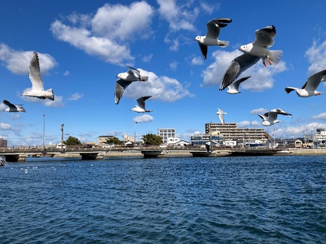 寒波の中でも、参加者のみなさんは水上からの景色に大歓声。カモメへの餌やり体験も大盛り上がりでした。